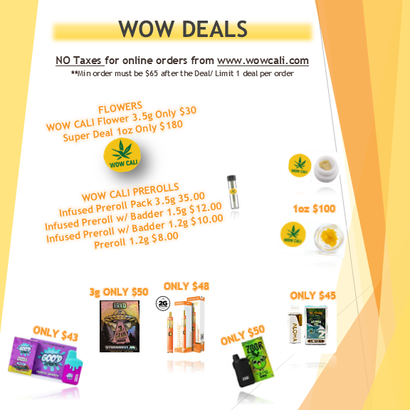 With one of the broadest medical cannabis product selections in Orange County, WOW CALI delivers everything from flowers, concentrates, to edibles, cartridges, pre-rolls, tinctures, topicals, pens and much, much more.